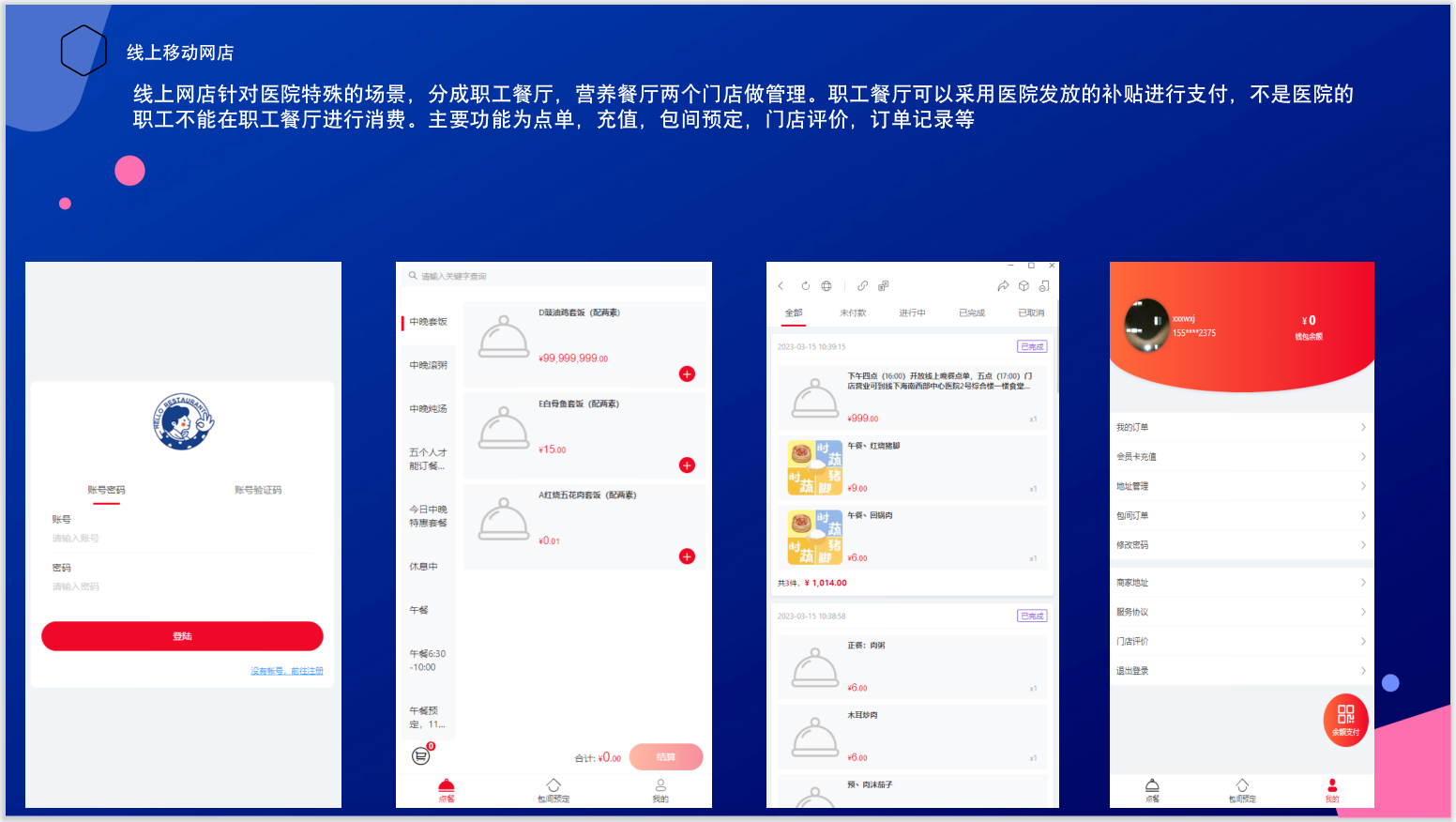 線上(shàng)網店(diàn)針對(duì)↕→醫(yī)院特殊的(de)場(chǎng)景,分(fēn)成職工(gōng)↕↑β$餐廳,營養餐廳兩個(gè)門(mén)店(diàn)做(£←zuò)管理(lǐ)。職工(gōng)餐廳可(kě)以采用(yòng∑©)醫(yī)院發放(fàng)的(de)補貼進行(xín¥∏↕ g)支付,不(bù)是(shì)醫(yī)院的(de)職工(∑© gōng)不(bù)能(néng)在職工(gōng)餐廳≠ "進行(xíng)消費(fèi)。主要(yào)功能(nδ¥éng)為(wèi)點單,充值,包間(jiān)預定,門(mén)店(∑♠diàn)評價,訂單記錄等