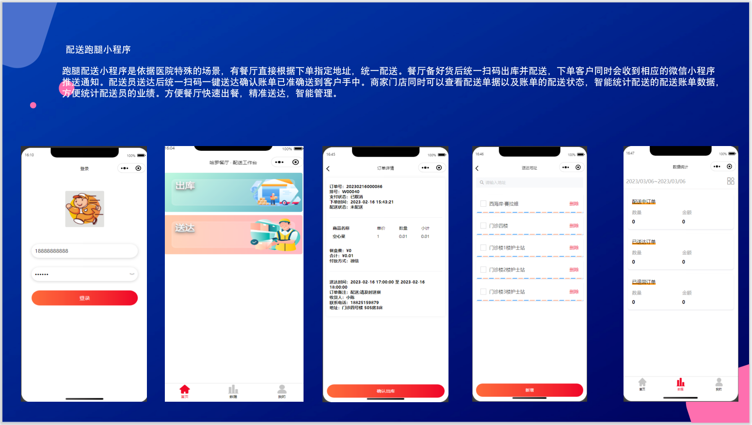 跑腿配送小(xiǎo)程序是(shì)依據醫(yī)院特δ殊的(de)場(chǎng)景,有(yǒu)餐廳直接★↑根據下(xià)單指定地(dì)址,統一(yī)配送。餐↑×≈廳備好(hǎo)貨後統一(yī)掃碼出庫并 ∏×配送,下(xià)單客戶同時(shí)會(huì)§↔®收到(dào)相(xiàng)應的(de)微(wēi)信小(♠σxiǎo)程序推送通(tōng)知(zhī)。配送員(yuán)送達後ελ↑✘統一(yī)掃碼一(yī)鍵送達确認賬單已準确送到(dào)客戶手中。商家(jiā)門(mén₽Ω↔")店(diàn)同時(shí)可(kě)以查看(kàn)配送單據以及賬單的(♣←↕de)配送狀态,智能(néng)統計(jì)配送的(de)配送賬單數(shù)↑®↔據,方便統計(jì)配送員(yuán)的(de)δ 業(yè)績。方便餐廳快(kuài)速出餐,精準送達,智能(néng)£ ¶管理(lǐ)。