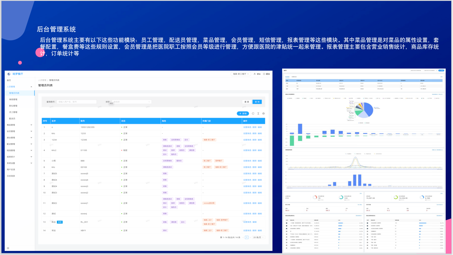 後台管理(lǐ)系統主要(yào)有(yǒu)以下(xià)∞≠♣©這(zhè)些(xiē)功能(néng)模塊:員(yuán)工(gōng)管∑Ω理(lǐ),配送員(yuán)管理(lǐ),菜品管理(lǐ),會(→ ®huì)員(yuán)管理(lǐ),短(duǎn)信管§δ™理(lǐ),報(bào)表管理(lǐ)等這(♣↓♥¥zhè)些(xiē)模塊。其中菜品管理(l☆≤ ǐ)是(shì)對(duì)菜品的(de)屬性設置,套餐配置,餐盒₩£±₩費(fèi)等這(zhè)些(xiē)規則設★←₽∞置,會(huì)員(yuán)管理(lǐ)是(shì)把醫(yī)院職工∑§♦(gōng)按照(zhào)會(huì)員(yuán)等級進行(x<"íng)管理(lǐ),方便跟醫(yī)院的(de)津貼統≥✔<✘一(yī)起來(lái)管理(lǐ)。報(bào)表管理(l<÷$ǐ)主要(yào)包含營業(yè)銷售統計&δ (jì),商品庫存統計(jì),訂單統計(jì)等